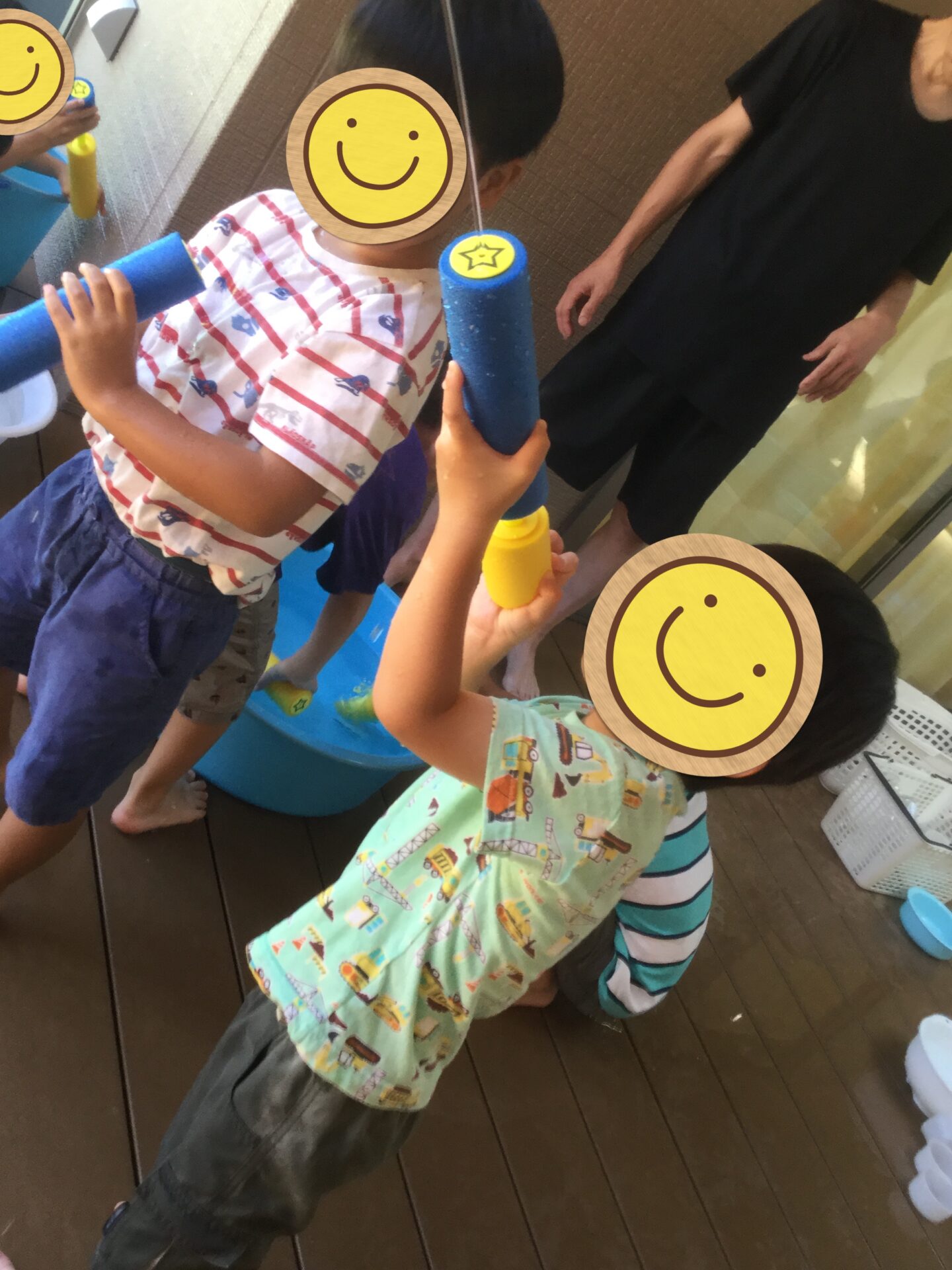 お外で水遊び☀️ 水鉄砲を使って、みんな的にめがけて、命中🎯