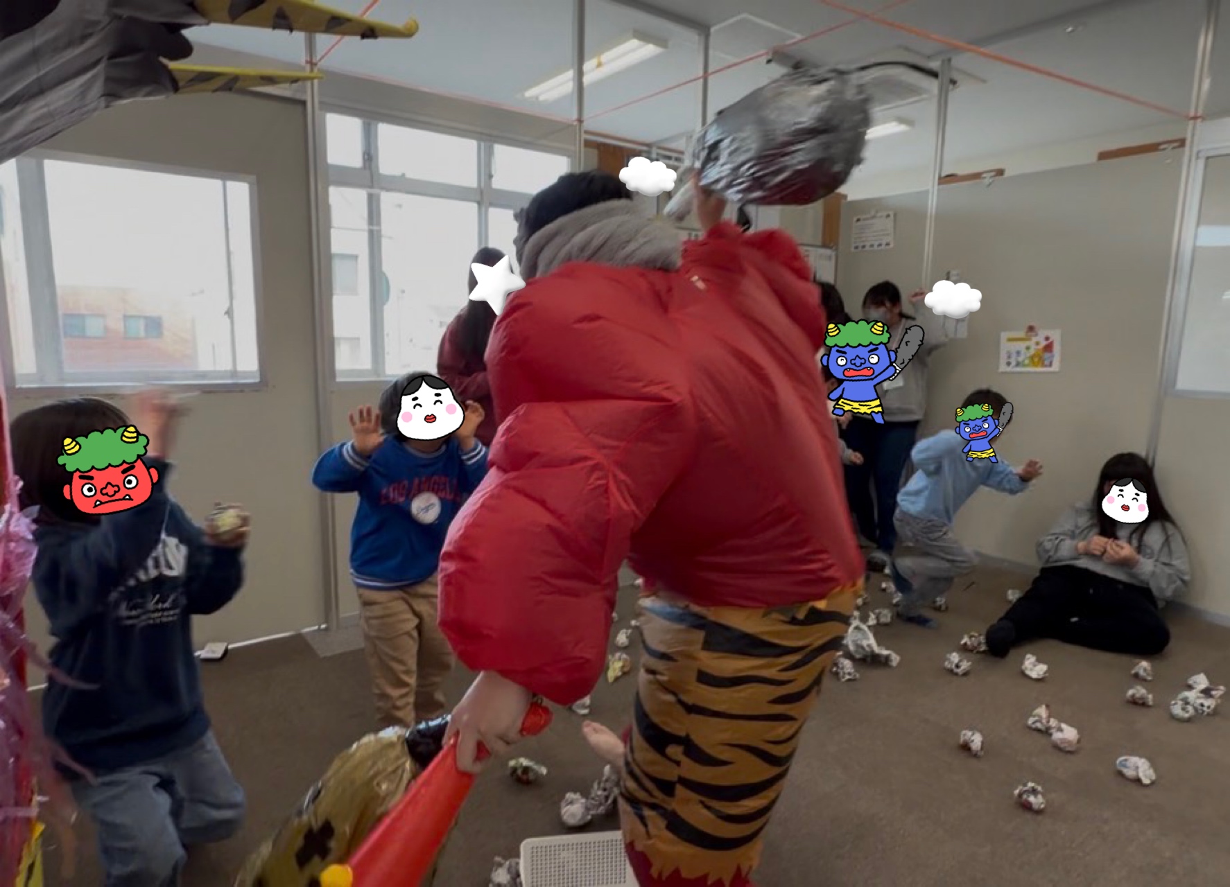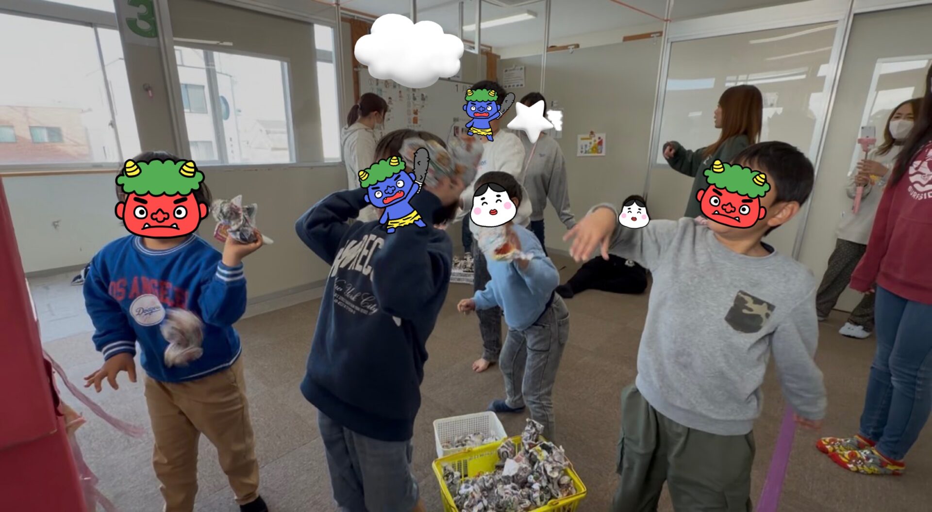みんなで一緒に「おにはそと〜ふくはうち〜!」といいながら
