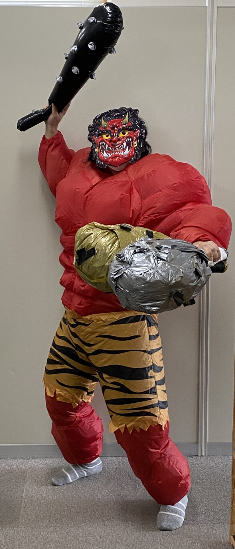 ダンボールの鬼で豆まきの練習をしていると‥
