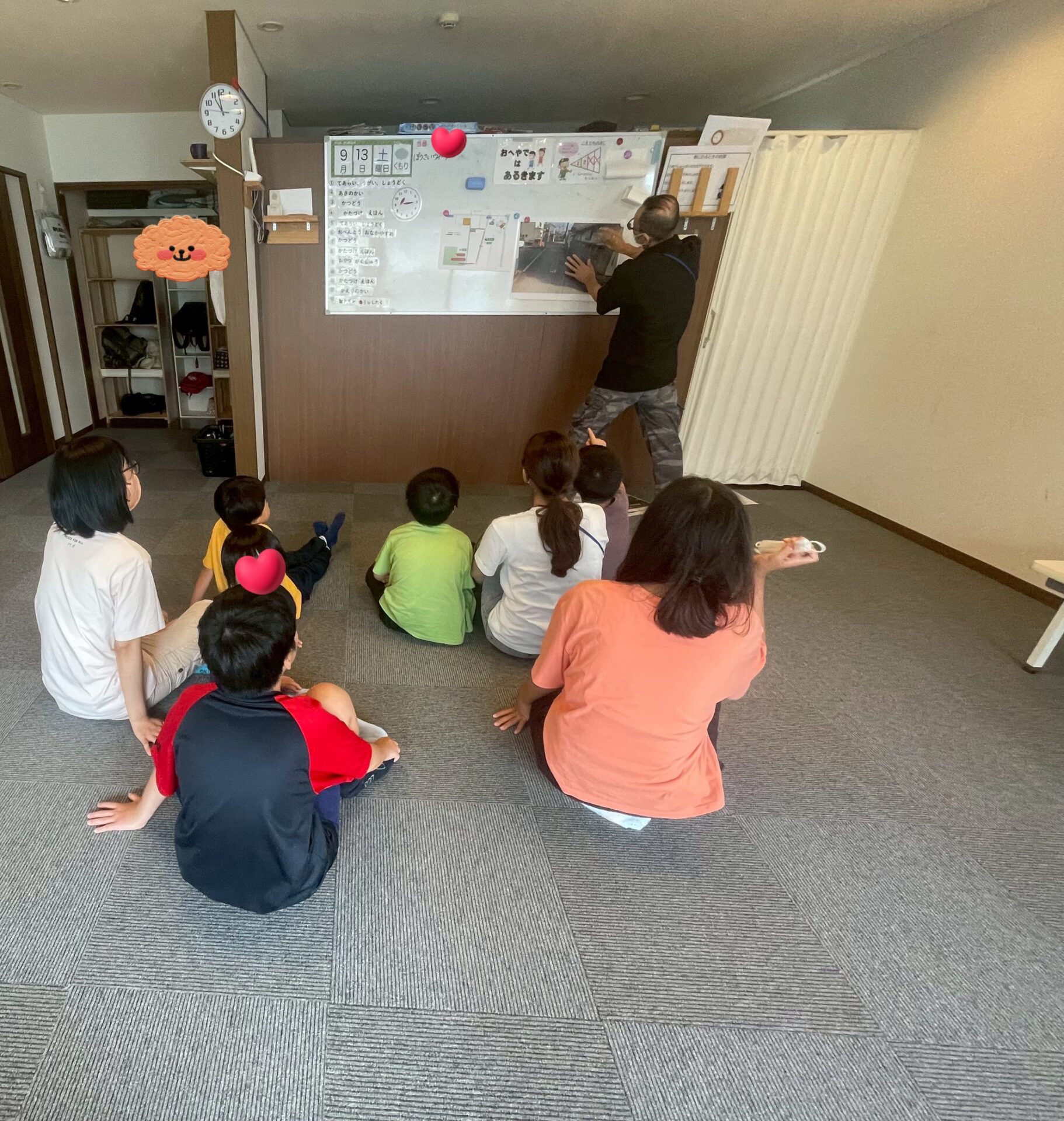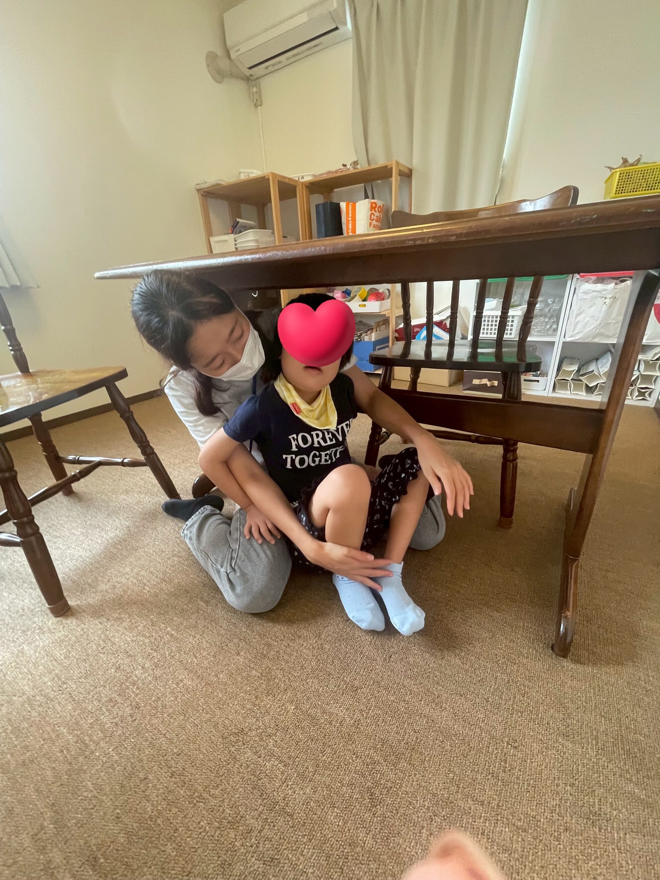 いつも使っている室内の中で実際に地震が起きたらどうするのか子ども達と考えながら行いました。